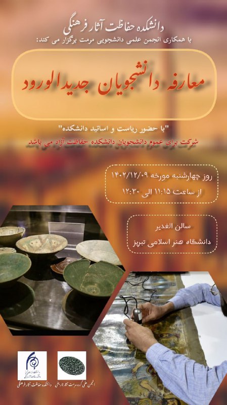 دانشکده حفاظت آثار فرهنگی با همکاری انجمن علمی دانشجویی مرمت برگزار میکند: “معارفه دانشجویان جدید الورود” زمان: روز چهارشنبه مورخ ۱۴۰۲/۱۲/۹ مکان: سالن الغدیر دانشگاه هنر اسلامی تبریز حضور دانشجویان جدید الورود در دو مقطع کارشناسی و کارشناسی ارشد الزامی است.
