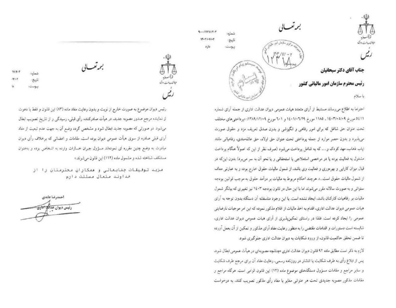✔️مکاتبه رئیس دیوان عدالت اداری با رئیس محترم سازمان امور مالیاتی کشور در خصوص عدم شمول مالیات حقوق بر رفاهیات و پرداخت‌های انگیزشی