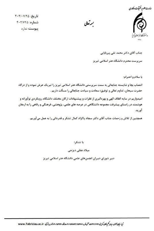 انتصاب بجا و شایسته جنابعالی به سمت سرپرستی دانشگاه هنر اسلامی تبریز را تبریک عرض نموده و از درگاه حضرت سبحان، تداوم تعالی و توفیق؛ سعادت و سیادت جنابعالی را مسألت داریم .