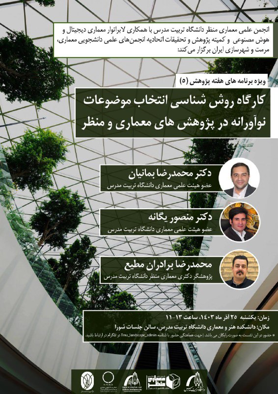🌱انجمن علمی دانشجویی معماری منظر دانشگاه تربیت مدرس با همکاری لابراتوار معماری دیجیتال و هوش مصنوعی و کمیته پژوهش و تحقیقات اتحادیه انجمنهای علمی دانشجویی معماری، مرمت و شهرسازی ایران به مناسبت هفته پژوهش برگزار میکند: