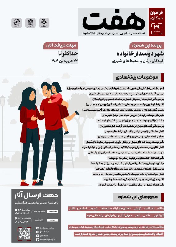 باسلام از اساتید، دانشجویان و علاقهمندان دعوت به عمل میآید تا در فصلنامه (شماره ۲۹) نشریه هفت انجمن علمی شهرسازی دانشگاه شیراز، با محوریت شهر دوستدار خانواده، همکاری نمایید.