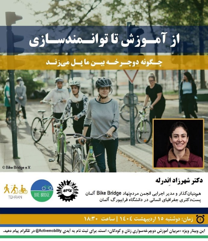 این وبینار (رایگان) ویژه «مربیان آموزش دوچرخه‌سواری زنان و کودکان» است. برای ثبت نام و کسب اطلاعات بیشتر به آیدی @Activemobility در تلگرام پیام دهید.