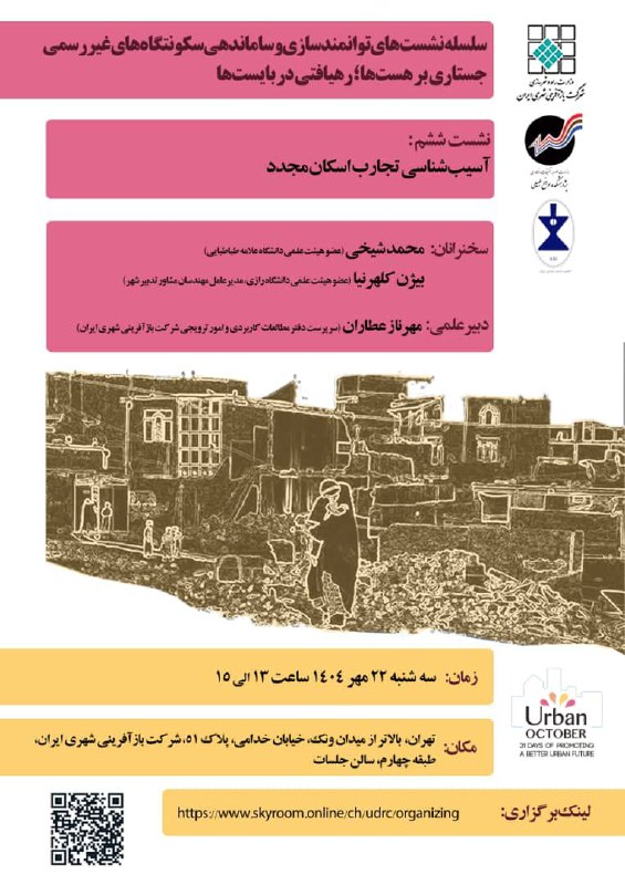 🏙 شرکت بازآفرینی شهری ایران با همکاری کمیته ملی اسکان بشر، پژوهشکده سوانح طبیعی و کارگروه انسان شناسی شهری انجمن انسانشناسی ایران در قالب کمپین جهانی اکتبر شهری (Urban October) برگزار میکند: