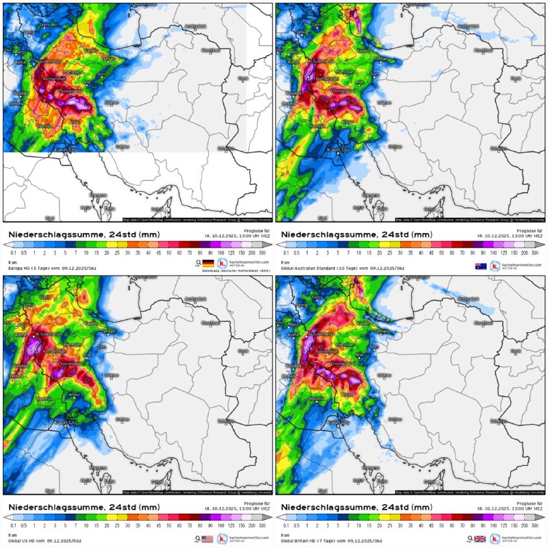 ⚠️ این چهار مدل مجموع بارش بامداد تا ظهر روز فردا چهارشنبه را نشان میدهند. در برخی نقاطی که از توپوگرافی مستعدی برخوردار هستند امشب تا ظهر فردا 50 تا 100 میلیمتر باران تخلیه خواهد شد که عدد قابل توجهی خواهد بود.