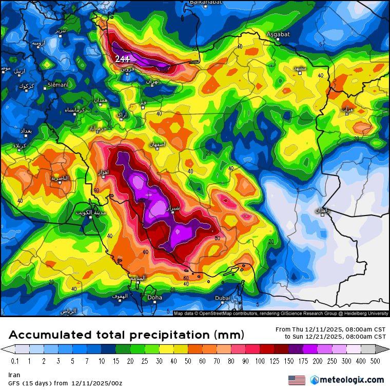 نقشه تازه مدل جهانی GFS که از سوی وبسایت meteologix منتشر شده، از وقوع یک دوره بارندگی گسترده و نسبتاً شدید در بسیاری از استانهای کشور طی بازه ۲۱ تا ۳۰ آذر ۱۴۰۴ خبر میدهد.