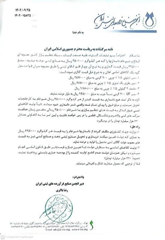 💠 نامه انجمن صنایع فرآوردههای لبنی به رئیسجمهور در پی گرانی لبنیات