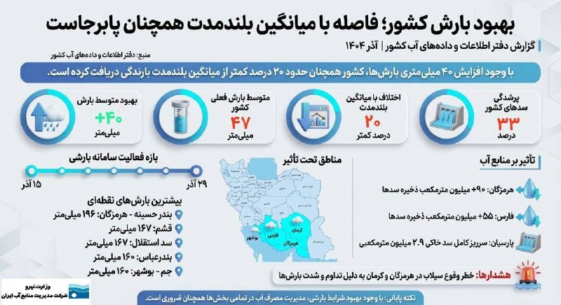🔸متوسط بارش کشور ۴۰ میلیمتر بهبود یافته اما همچنان ۲۰ درصد کمتر از میانگین بلندمدت است.