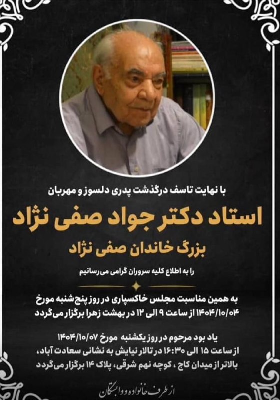 جناب آقای دکتر جواد صفی نژاد استاد دانشگاه و پژوهشگر برجسته حوزه آب و قنات، چشم از جهان فروبستند.